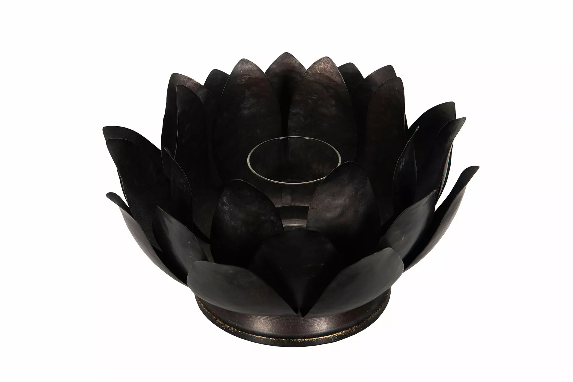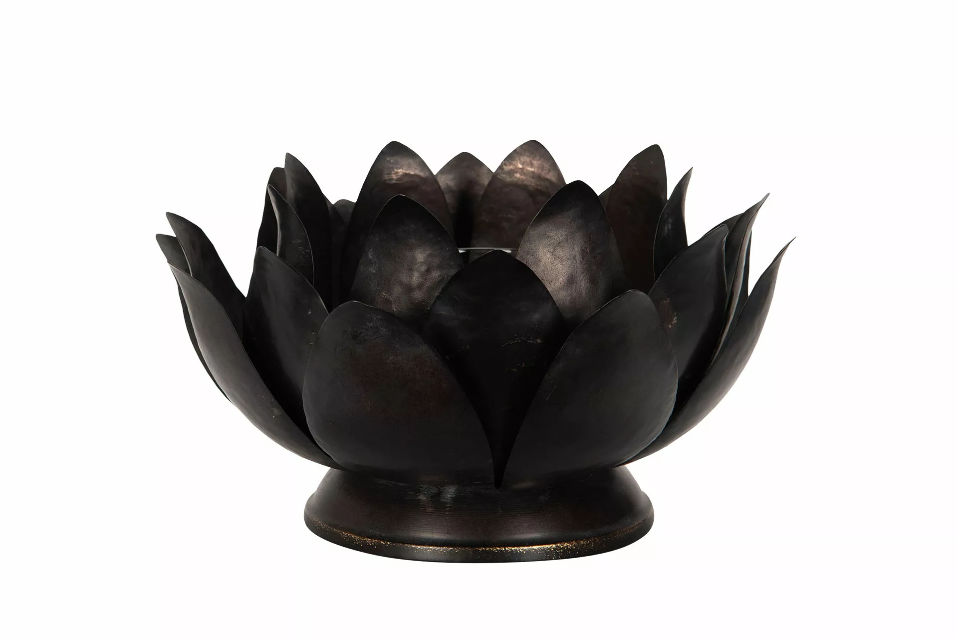 Denna ljuslykta i svart och mässing är en elegant inredningsdetalj som skapar en varm och stämningsfull atmosfär i ditt hem. Designen är inspirerad av en blomma med öppna kronblad, där metallen ger en vacker och subtil glöd när ljuset är tänt. Perfekt för att lysa upp mysiga kvällar, samtidigt som den tillför en touch av modern elegans till ditt hem.
