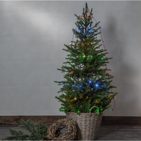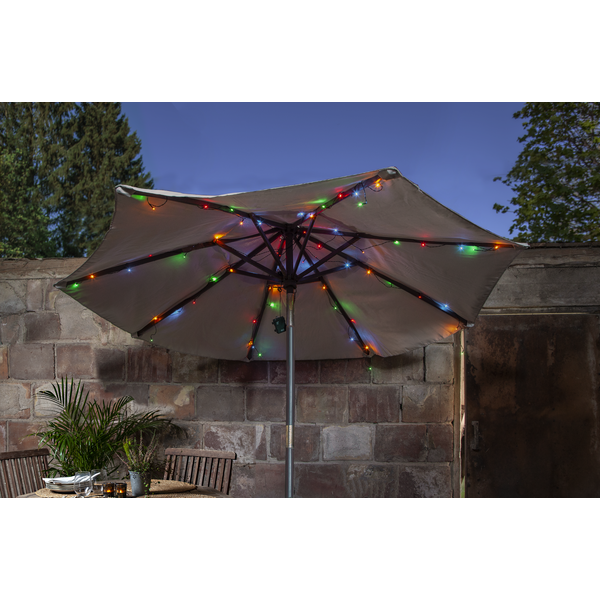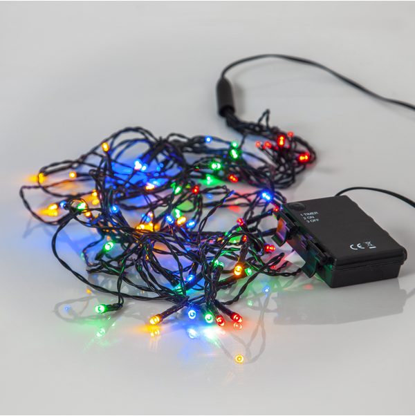 Slinga med 64 flerfärgade ljuspunkter med batteribox för både inom- och utomhusbruk, drivs med 3xAA batterier. För optimal livstid av batterierna har slingan repeterande timer funktion, 6 timmar på och 18 timmar av. Utmärkt att använda som parasollslinga under sommartid och som granslinga till jul.