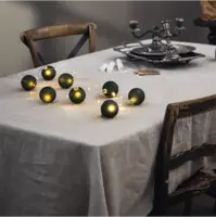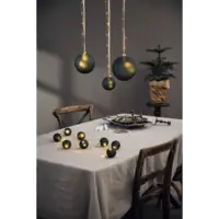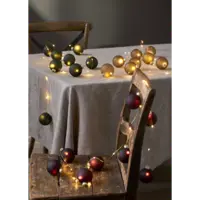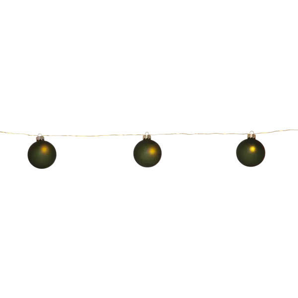 Vacker batteridriven ljusslinga med 8 st mörkt gröna glaskulor. Mässingsfärgad slinga med små ljuspunkter i varmvit LED. Perfekt för tex bordsdekoration och julgransbelysning och ger en härlig stämning i hemmet. För inomhusbruk