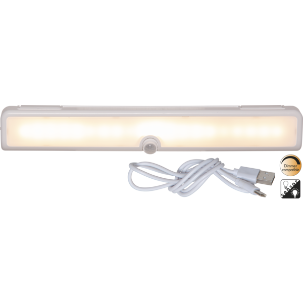 Nattlampa med skymningssensor. Drivs med 3 st AA batterier (lyser med 150lm) eller med USB kabel (lyser med 250lm). Välj mellan rörelsesensor (AUTO läge) eller fast sken (ON läge). Dimbar med reglage, 25/50/100%. Justerbara väggfästen på baksidan. För inomhusbruk!