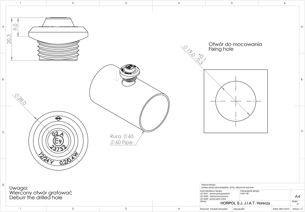 Vitt positionsljus med mörk tonat glas för 60mm rörmontage.