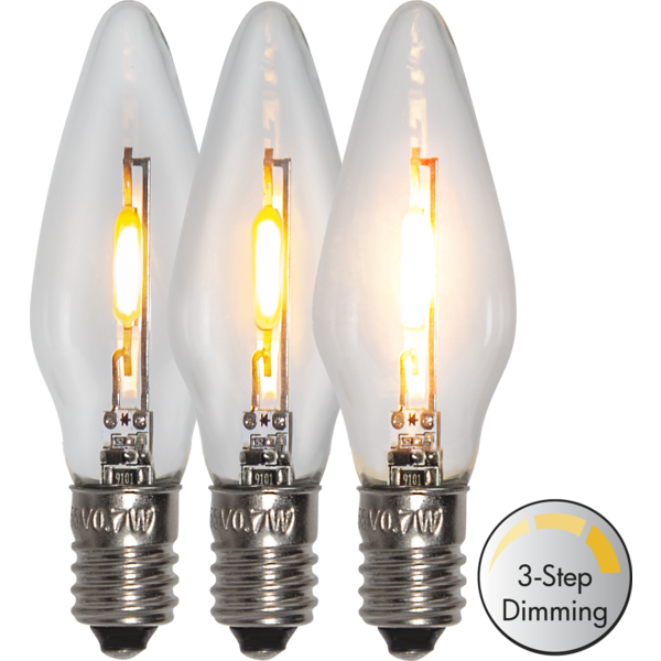 5-pack reservlampor med klart glas, E10 sockel och 3-stegs klickdimringfunktion! Ljusstyrkan ändras enkelt genom slå av och på strömbrytaren. Passar ljusstakar med 4-16 ljus. Startar på starkaste ljusstyrkan. För inomhusbruk.