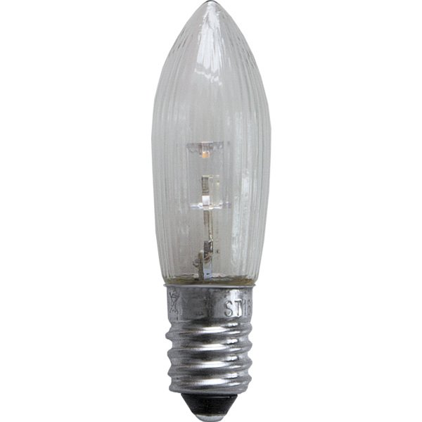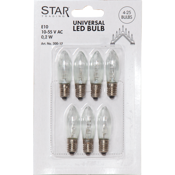 7-pack reservlampor med LED, klart glas, E10 sockel och 10-55V. Denna produkt passar till ljusstakar med 4-25 lampor och stickkontakt. För inomhusbruk.
