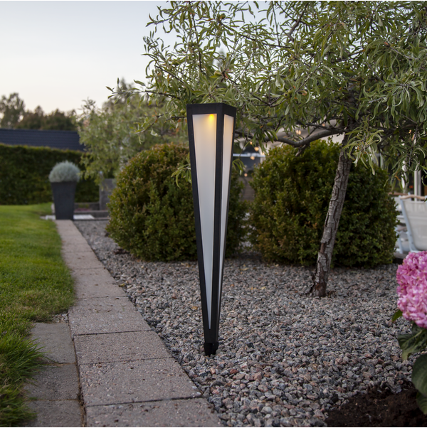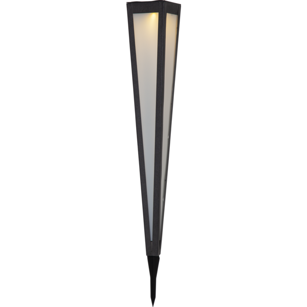 Pyramis är en solcellsbelysning gjord i svart metall. Det varmvita ljuset lyser vackert genom det frostade höljet och blir en vacker dekoration. Den är fin att placera i en gång eller en plantering i din trädgård eller på en balkong. Placera solcellspollaren där solen kan nå panelen under dagen för att få ultimat laddning till det medföljande batteriet.